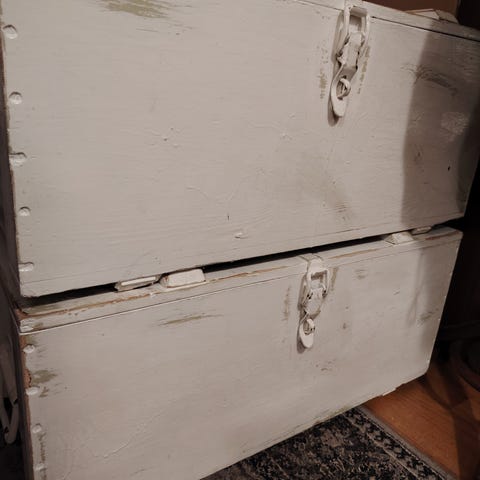 Kansi sulkeutuu hyvin ja saranat toimivat moitteettomasti. Ulkonäkö on kauniin kulunut, rustiikkinen ja rosoinen – täydellinen lisä sisustukseen tai säilytykseen!