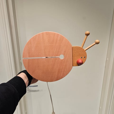 Seinään kiinnitettävä puinen leppäkerttu lamppu.koko 16x17.5cm.
