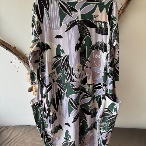 Martinexin Moomin -raidallinen tunika taskuilla, kuva hiukan vääristää väriä, on tummansini-punainen eikä ihan niin joulunpunainen kuin kuvissa. Kokomerkintää ei löydy mutta on varmaankin kokoa L. Rinnan kohdalta leveys noin 48 cm ja vyötärö noin 52 cm, alempaa taskujen alaosasta noin 70 cm.