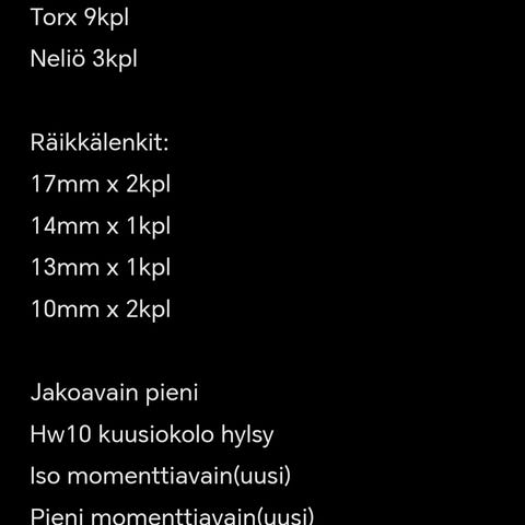 Tallitavaraa, meisselit, Räikkälenkit, momenttiavaimet, Hitsausmaski yms