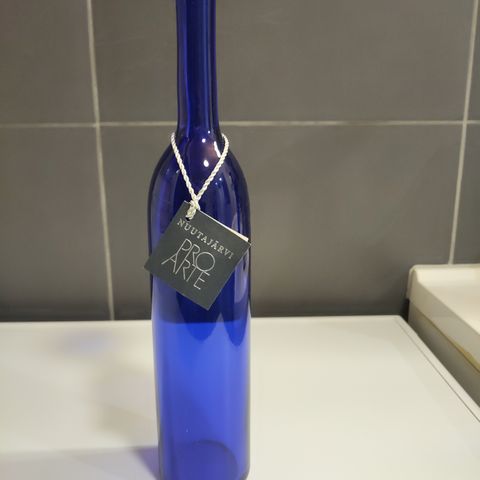 Koboltinsininen taidelasipullo, kork. 36cm. Signeeraus " Oiva Toikka Nuutajärvi 574/2000" Pahvilappu kaulassa.Myynnissä myös matalampi sininen pullo.