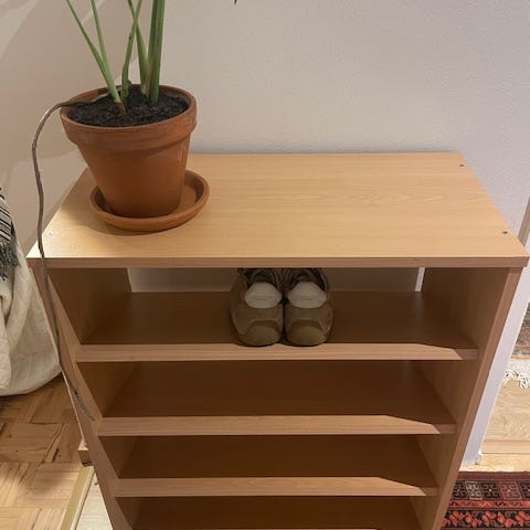 Myydään Inarian kenkähylly, mutta mekanismi varmasti sopiva myös muiden vaatekaappien kiskoihin. Yhteensopivan välikön leveys ~432mm. Itse kenkähyllyn kokonaisleveys 42,5cm, syvyys 48,7cm.