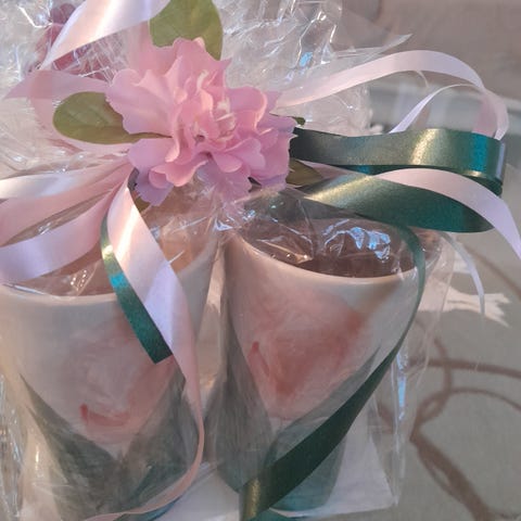 Kaksi samantyylistä, koristeellista astiasettiä, joissa kaunis vaaleanpunainen kukkakuviointi ja klassinen muotoilu. Molemmissa setissä kannu, yhteensopiva lautanen ja kupit.