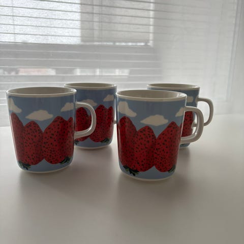 Uuden veroiset Marimekon mansikat. Myydään settinä 100€ yhteensä. Kaksi mukia ja kulho.