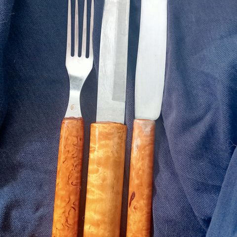 Visakoivuiset hedelmäveitset (6) jalustalla uutta omistajaa etsimässä.