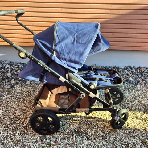 Aina sisällä säilytetyt rattaat. Musta vaunukoppa, tummanharmaa ratasosa. Todella hyvät isot renkaat, jotka kulkevat säässä kuin säässä ja kaikenlaisissa maastoissa. Jousitus myös suunniteltu erilaisiin maastoihin.