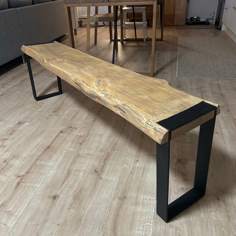Kaunis katseenvangitsija. Valkoiseksi maalattu vanha penkki mihin istuiosat päällystetty kauniilla, laadukkaalla kankaalla.