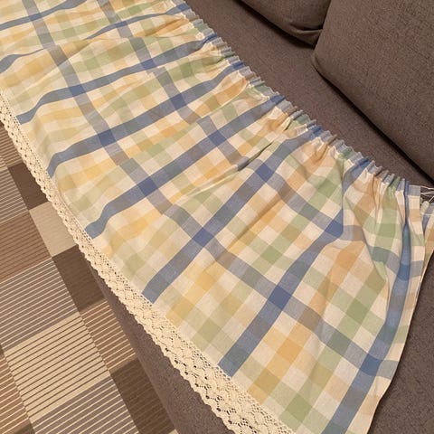 Vanha tummanruskea sileäsamettinen kappaverho, piparkakkureuna. Alareunassa ruskea koristenauha. Pituus 360 cm, korkeus 28-36 cm. Verhossa on tukikangas ja vuoritus takana. Tarkoitettu suoraksi, ei poimuille. Ehjä ja siisti. Postitus tai nouto.