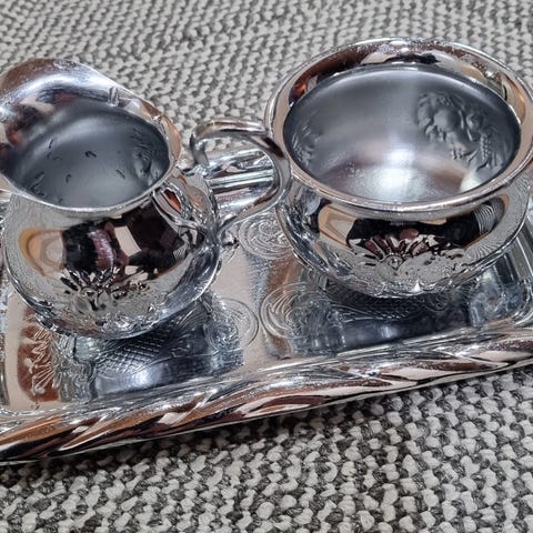 Hyväkuntoiset vanhat tinaesineet.Kannu,sokerikko,kermakko.