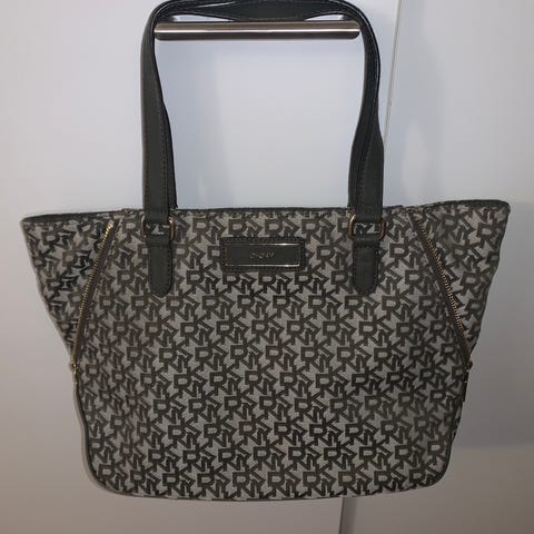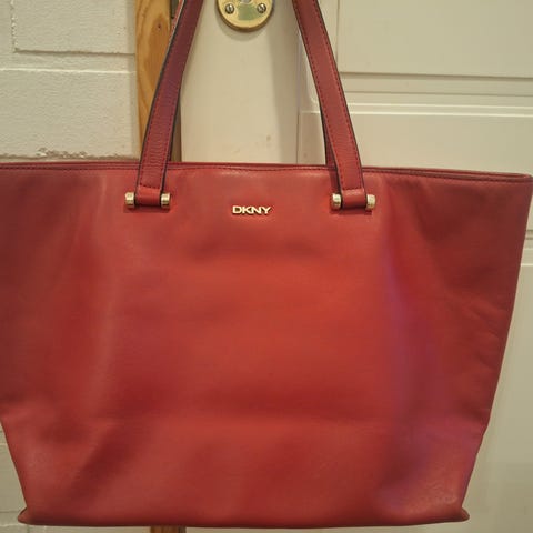 Punainen pikkulaukku DKNY merkiltä, kultaiset metalliosat. Koko L 18,5 cm, K 11 cm ja pohjanleveys 6 cm.