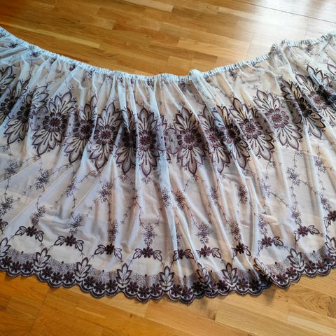 Näyttävä ja pitkä brodeerattu verho. Pituus 99 cm, leveys 3,97 cm