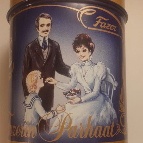 Pyöreä metallinen Fazer kakkurasia. Halkaisija 22 cm, korkeus 9 cm. Ihan pienet kolhut kannessa, näkyvät kuvassa. Vuodelta 1998.