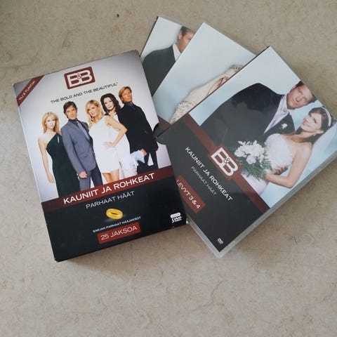 Myydään kuvan hyväkuntoiset Kauniit ja Rohkeat Parhaat Häät -DVD levyt. Sisältää 25 jaksoa, 5 DVD:tä yhdessä boksissa. Legendaariset Ridgen ja Carolinen häät sekä monet Brooken ja Ridgen ja Taylorin ja Ridgen häät, on paljon muitakin mm. Rick ja Amber, Macy ja Deacon. Yli 8h Kaunareita.