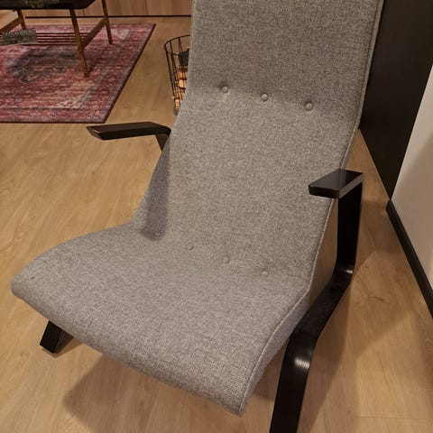 Erinomaisessa kunnossa. Istuinkangas harmaata villaa. Runko tammea.