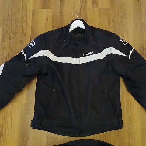 Course 2-osainen ajopuku koossa 56. Ollut käytössä 180cm/80kg miehellä. Takin sisävuori irrotettava vetoketjulla. Todella hyvässä kunnossa.