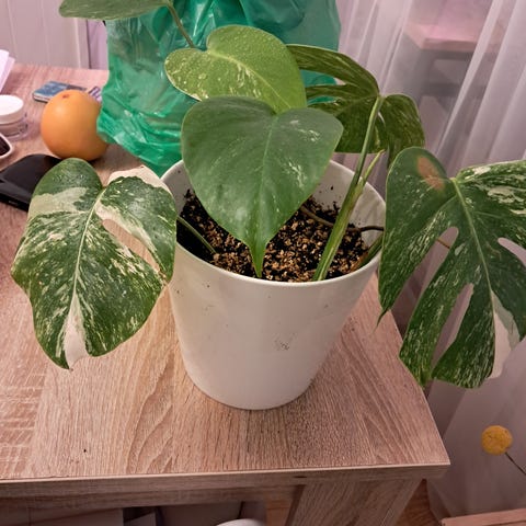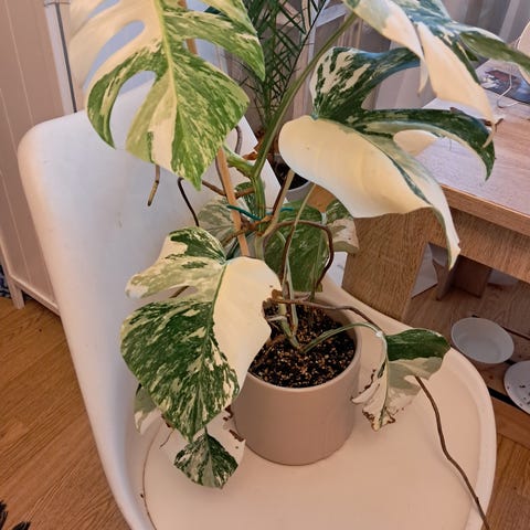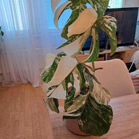 cm. Ruukun pohjalta. Uso ruukku. Ei tarvi vaihtaa lähiaikoina. Monstera variegata albo ' peikonlehti. Alhalta tulee uusi alku . Voi leikata ja tulee uusi kasvi. Hyvä variegatio.