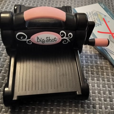 Leikkuri askarteluun. Levyt käytetyt, mutta kaikin puolin ehjät. Sizzixin Big Shot A5 kokoinen stanssaus- ja kohokuviointilaite aloituspakkauksella. Laitteella voi stanssata silkkipaperista korkkiin kuten myös kangasta tai puuta oikeanlaisella stanssilla.