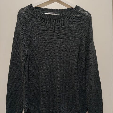 Selästä avoin ohuehko neulospaita, jossa pääntiessä ja hihansuissa näyttävä paljetti- ja helmikoristus. Ei koko- ja materiaalimerkintää, mutta n. 38/40, ohuehkoa, joustavaa, hiukan liukasta neulosta. Rinnanympärys venyttämättä n. 87 cm (venyy reilusti), olka-helma n. 55 cm. 3/4-hihat (olka-hihansuu n. 43 cm). Jäänyt täysin käyttämättömäksi, eli uudenveroinen.