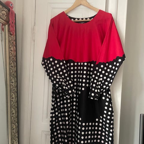 Ompelijan Tampellan Gardenia -verhokankaasta (suunnittelija Marjatta Metsovaara 1970-luvulla) ompelema marimekko-tyyppinen mekko.