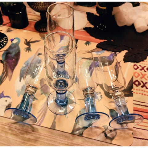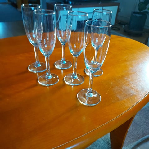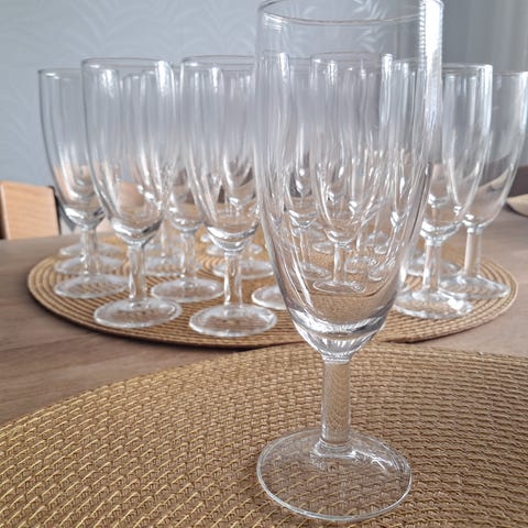 Kerran ylioppilasjuhlissa käytetyt kuohuviinilasit. Kokonaiskorkeus n. 20cm.