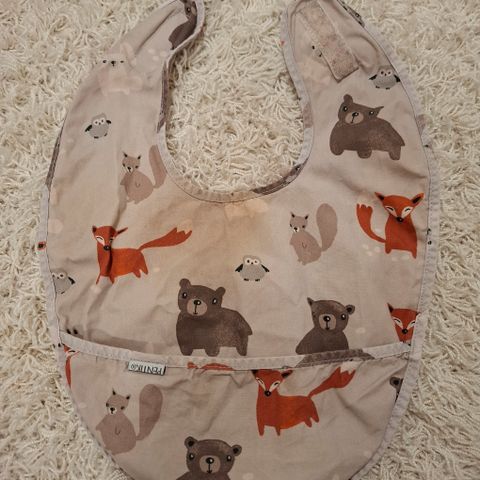 Pentik vaaleanpunainen ruokalappu. 100% puuvilla. Akryylipinnoite. Leveys noin 24cm, koko pituus noin 30cm.