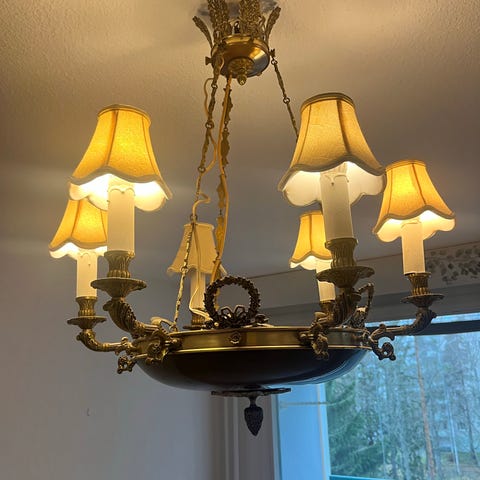 Vanha upea kattovalaisin. Chippendale? Olisiko 40-luvulta tai 50-luvulta. Ikäisekseen hyvässä kunnossa, ainoastaan sähköjen osalta vaatinee kunnostusta. Kaunis puinen /metallinen runko, puhallettua lasia pisarakoristeet. Nouto onnistuu sopimuksen mukaan myös Hyvinkää tai Kangasala.