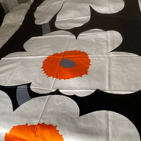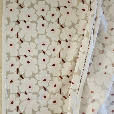 Marimekko mini unikko normi puuvilla. Pohja valkoinen, unikko syväsininen, keskiö ja varsi lämminruskea. Sopii esim kasseihin, koristetyynyihin, patalappuihin, kaitaliinaan jne.
