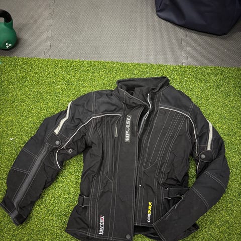 Kangaspintainen, tukevaa hyvää kangasta. Kyynär- ja olkasuojat mukana. Tasku selkäsuojalle, jossa kevyt suoja (ollut ostettaessa). Hinta 250e.