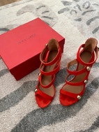 Myydään muutaman kerran käytetyt, punaista mokkanahkaa olevat Pura López merkkiset korkokengät. Pohja vahvistettu suutarilla kestämään asfaltilla kävelyä. Koko 40.