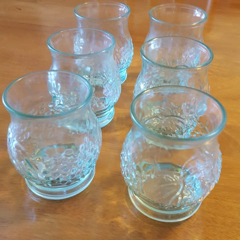 Kuusi kaunista turkoosia lasia ja lasikannu.Kannun pohjassa on pienen pieni halkeama,mutta se käy hyvin sisustusesineenä.