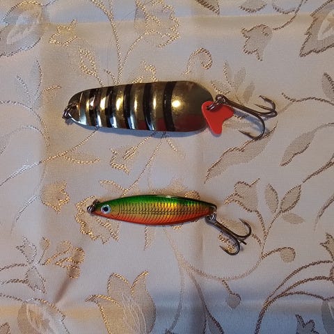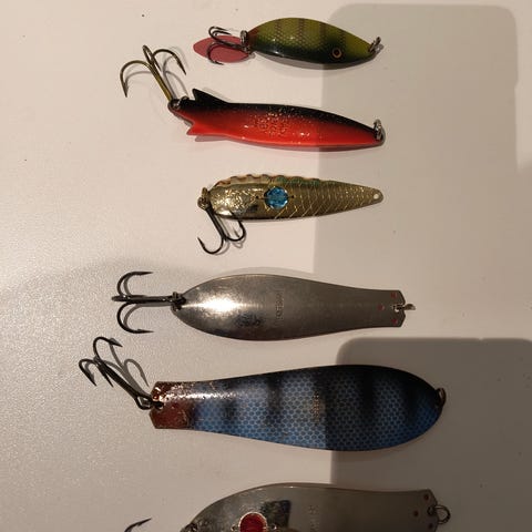 Setti käytettyjä lusikkauistimia kuvanmukaisessa kunnossa. Osa koukuista ja uistinrenkaista vaihdettavassa kunnossa. Uistimet toimitetaan kuvan vieherasiassa.