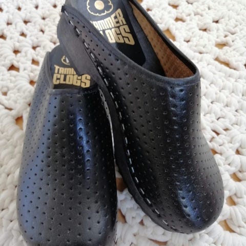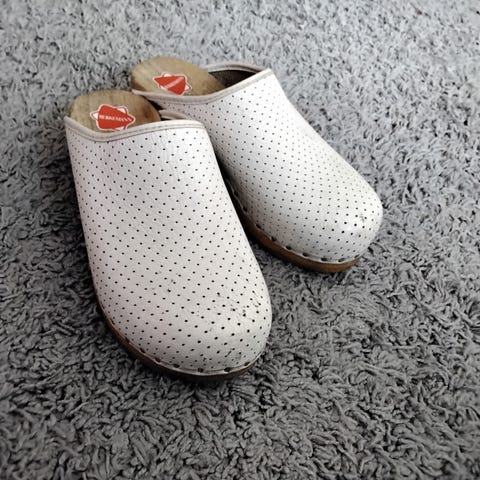Suomalaiset ja käsityönä Myrskylässä valmistetut hollannikkaat koossa 25. Valkoista reikänahkaa ja luistamaton kumipohja. Käytettynä ostettu, mutta kunto erinomainen. Hp. 7 €.