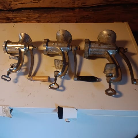 Kuvissa näkyvät lihamyllyt. Ruostetta ja ajanpatinaa löytyy. Toisesta puuttuu ainakin osia