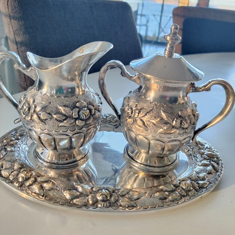 Kaunis turkoosilasia ja metallia. Kukkokuviollinen alusta.
