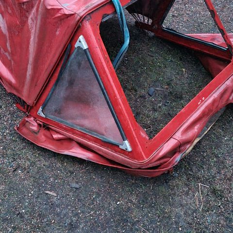 Tästä traktoriin vintage mallin "rättihytti". Ei ole ollut käytössä pariin vuosikymmeneen, joten ajan patinaa on havaittavissa. Pyyhkimen sulka puuttuu ja kuomussa on pientä laitettavaa. Tuulilasi on ehjä, sivulaseissa halkeamia, mutta pysyvät kasassa.