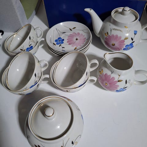 Dulevo kahvi/ tee astiat.1 kpl.iso lautanen+teekannu+ 3 kpl.pieni kuppi+3 kpl.lautasta.Yht.hinta 30€.