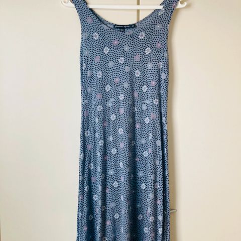 Pohjemittainen Gudrun Sjöden trikoomekko mustapohjaista viskoosielastaania harmaalla kasvikuviolla. Koko M, mitat venyttämättä kai-kai 52cm, vyötärön leveys poikkileikkauksen kohdalla 45cm ja mittaa voi muunnella solmittavalla vyöllä, helman leveys 75cm, olka-helma 118cm. Valekietaisuleikkaus yläosassa ja pitkät hihat. Hyvä käytetty kunto. 9e mmm