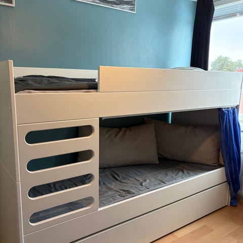 Myydään hyvässä kunnossa oleva valkoinen metallirunkoinen kerrossänky (Jysk).