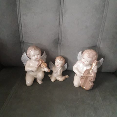 6kpl posliinienkeleitä ripustuslenkillä, enkelien korkeus 6cm, Enkelit ovat vuodelta 1992.