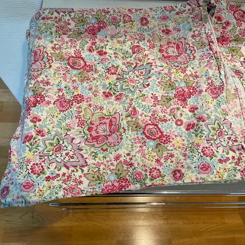 Käsityönä ommeltu. Uusia ja käyttämättömiä. Vaalealla pohjalla liilat kukat. Ohutta Puuvilla satiinia.