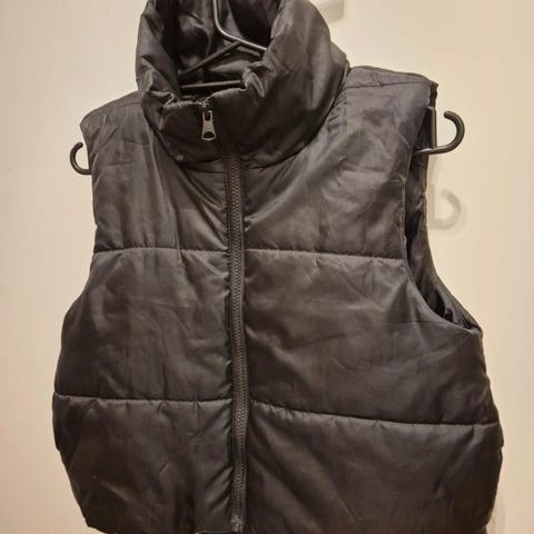Kuvien mukainen Onlyn kiiltävä, upea, hupullinen kevytoppaliivi. Edessä kaksi vetoketjullista taskua. Jotain pientä nöyhtää tulee kankaasta. Luultavasti koiran karvoja, jotka ovat "uineet" kankaaseen. Lähtevät nyppimällä irti. Toisen taskun kohdalla nuppinelajäljet ja toisen helman kohdalla jokin pieni purkauma ja toisen taskun kohdalla ehkä pientä likaa, jota en ole yrittänyt pestä. Kaikki virheet näkyvät kuvissa. Mittoja myös kuvissa. Koiratalous, joten jokunen karva voi tulla mukana putsauksesta huolimatta.