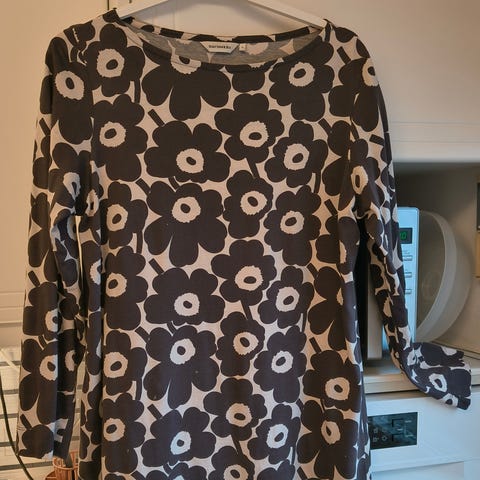 Malli: Tiedotus Pieni Tumma. Väljä malli vajaamittaiset hihat. Arkiasu ja kaunis kuosi. Ei haalistumia. Kunnossa. Harvassa käytössä, silloin ollut alla vihreä pitkähihainen.