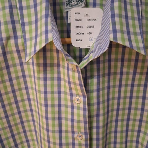 Edestä solmittava vyötärömallia kauluspaita napeilla. Koko 36-38. Viskoosia.