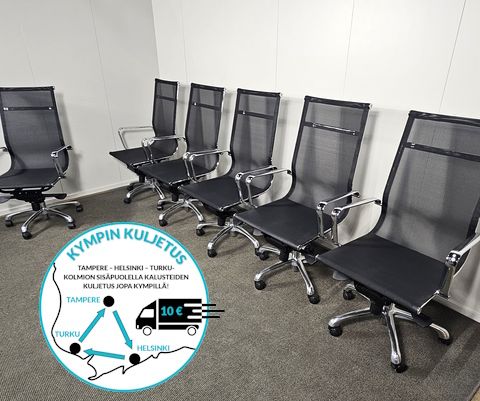 Hinta 150 € + alv 25,5% = 188,25€ / kpl. Varastossa 4 kpl. Tuolit ovat Tampereen toimipisteessä, liikkuvat tarvittaessa toimipisteiden välillä.