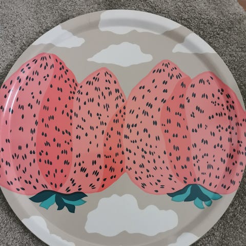Myynnissä uusi Marimekko Mansikkavuoret peltipurkki, koko 11 x 11 x 17,5cm.