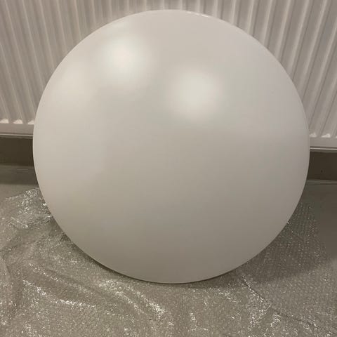 Läpimitta 50 cm, matta musta pinta, sisäosa kulta. Metallia.
