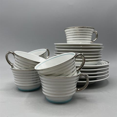 Arabian Raitakulta-malliston teekupit, kahvikupit ja lautasia. Raitakulta-kuvion on suunnitellut Greta Lisa Jäderholm-Snellman, tuotannossa v. 1932-49. Piippuleima.