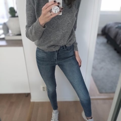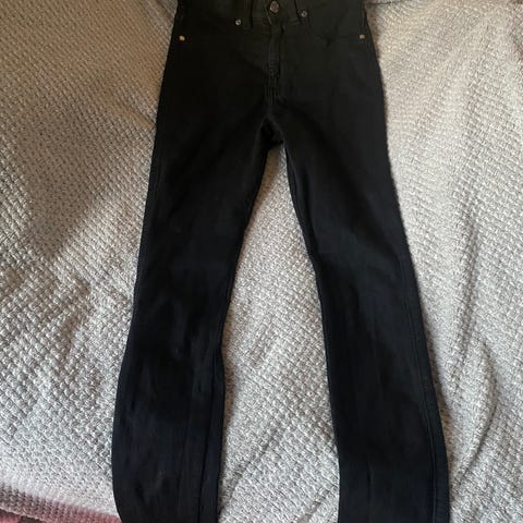Hyväkuntoiset naisten S kokoiset pillifarkut. Vyötärön ympärys on venyvää kuminauhaa ja farkut myös itsekkin jostavat jonkin verran.