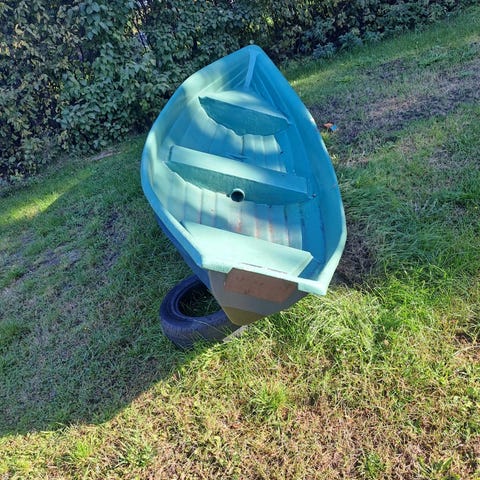 Kuvan puusta ja lasikuidusta valmistettu vene myydään eniten tarjoavalle. Veneessä on "pientä laittoa"
