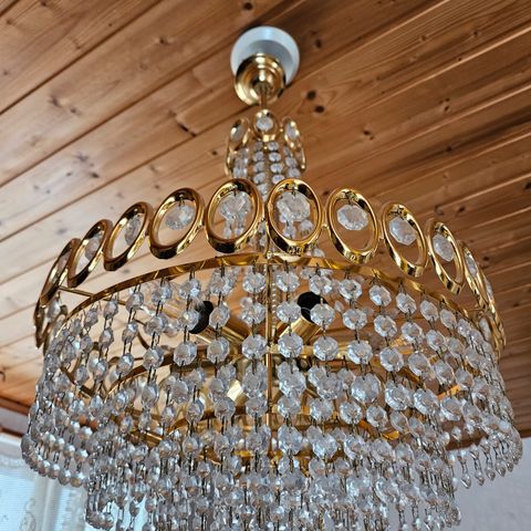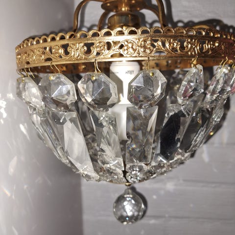 Siistissä käytetyssä kunnossa olevat Kristalli lampetit kullattua messinkiä 2kpl. Johdon pituus 140cm. Korkeus 16cm, leveys 15cm. Hinta yhteensä. Nouto Ylämyllyltä tai Liperistä. Koira /kissatalous. MMM